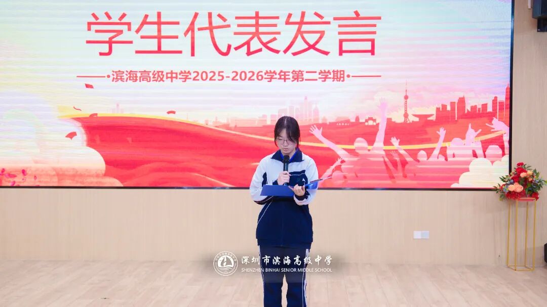 高三年级林如茵同学作为学生代表发言。她以《启航新征程,逐梦向未来》为题,号召全体同学在新学期里心怀梦想、脚踏实地、勇毅前行。“志不立,天下无可成之事”,她勉励同学们珍惜时光、勤奋学习,在奋斗中书写青春华章。真挚的话语、昂扬的斗志,赢得了现场师生的热烈掌声。