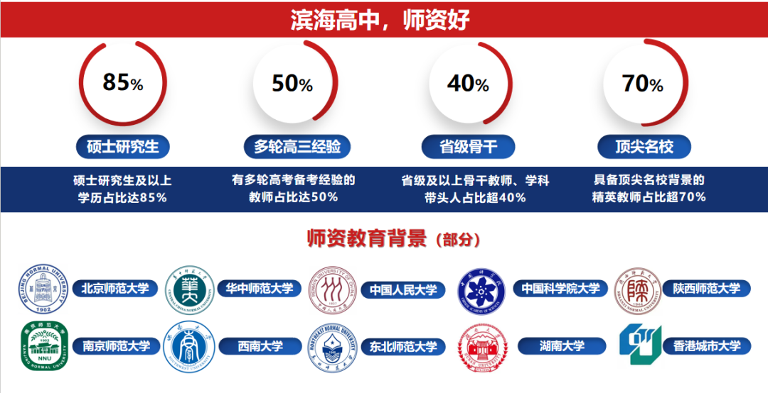 深圳市滨海高级中学拥有一支高水平、负责任的教师队伍。名优校长领衔,在文化课师资方面,学校硕士研究生及以上学历教师占比85%,超50%的教师具备多轮高考经验,省级骨干教师与学科带头人占比超40%,毕业于北师大、东北师大、陕师大等六所部属师范院校、或国内其他顶尖名校的精英教师超70%。