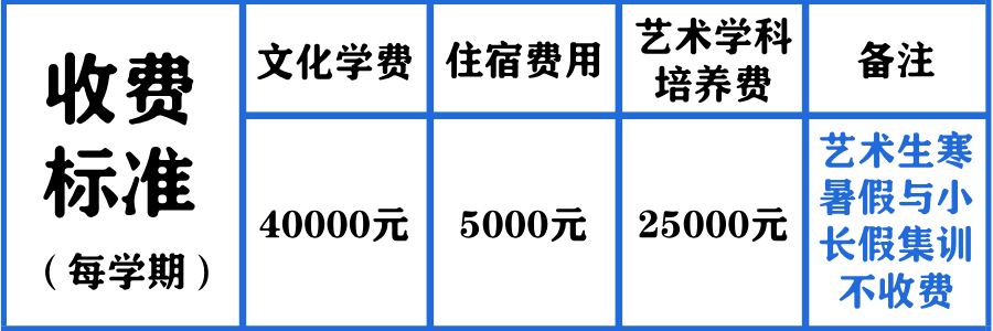 文化生学费:40000元/学期; 住宿费:5000元/学期; 艺术生艺术学科培养费:25000元/学期(文化生仅需缴纳文化生学费住宿费,无需缴纳此费用)。 *2026级高一普高新生预约访校即可享受高额学费住宿费减免(不包含港澳台生),名额有限,详情可咨询学校招生办公室。