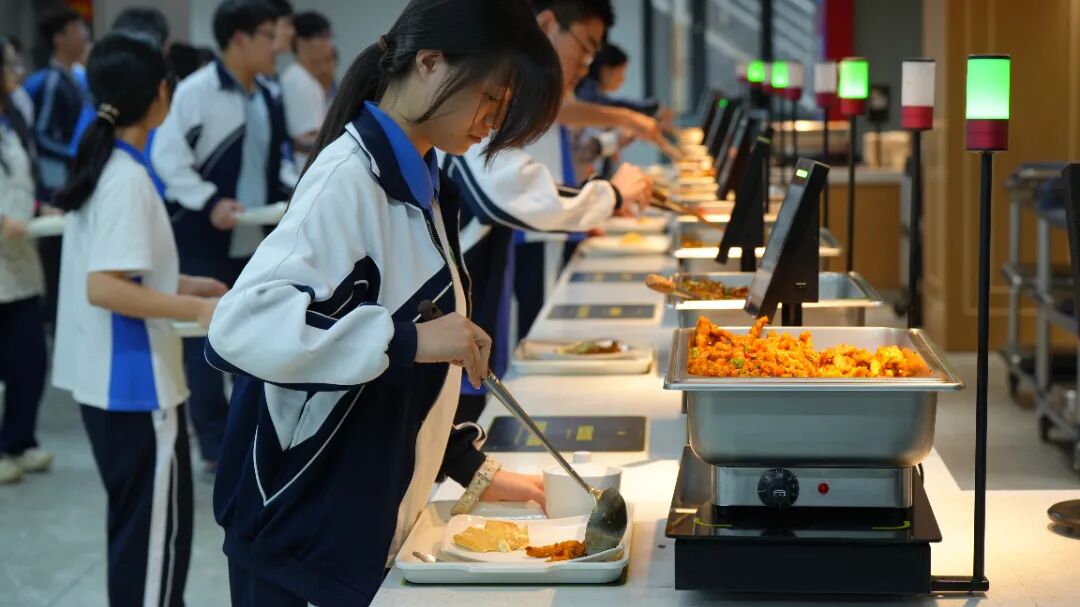 我校自营智慧食堂采用人脸识别进行支付,菜品按需自选、智能称重,避免浪费。家长可通过系统实时查看学生用餐情况。每餐均能提供约20种菜品选择,包括荤素搭配及炖盅水果,丰俭由人。餐厅可同时容纳1500人就餐,环境整洁,管理规范。