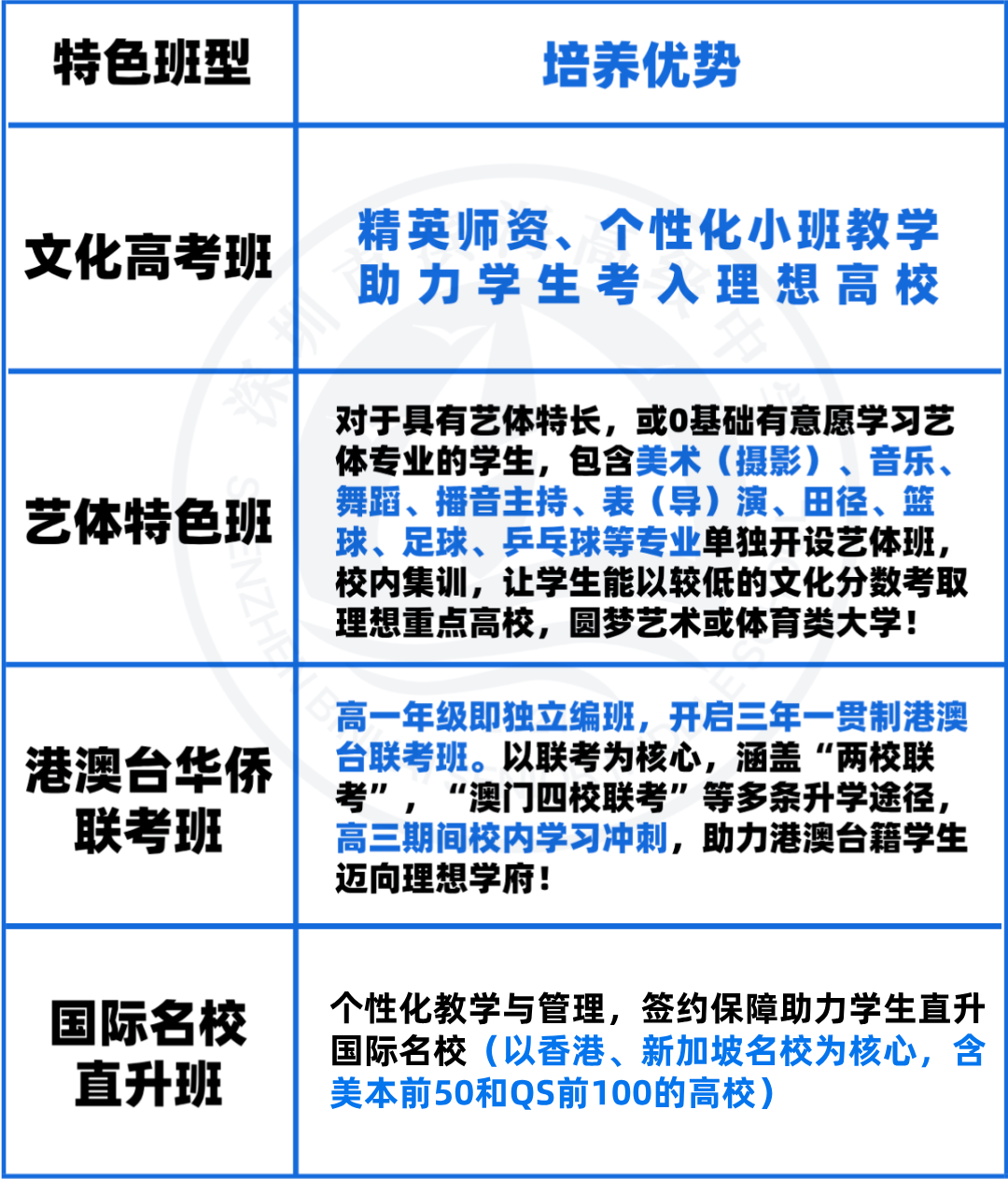 1、拟招生计划:2026年计划招生人数以相关部门实际审批公示为准,涵盖文化高考班、艺体特色班、港澳台联考班、国际名校直升班。